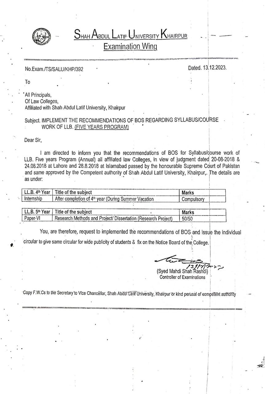This notification is issued on behalf of the Principal of A.B.D (Govt) Law College Sukkur for BA LL.B (Five-year program) Part IV & V batches of 2019 and 2018.