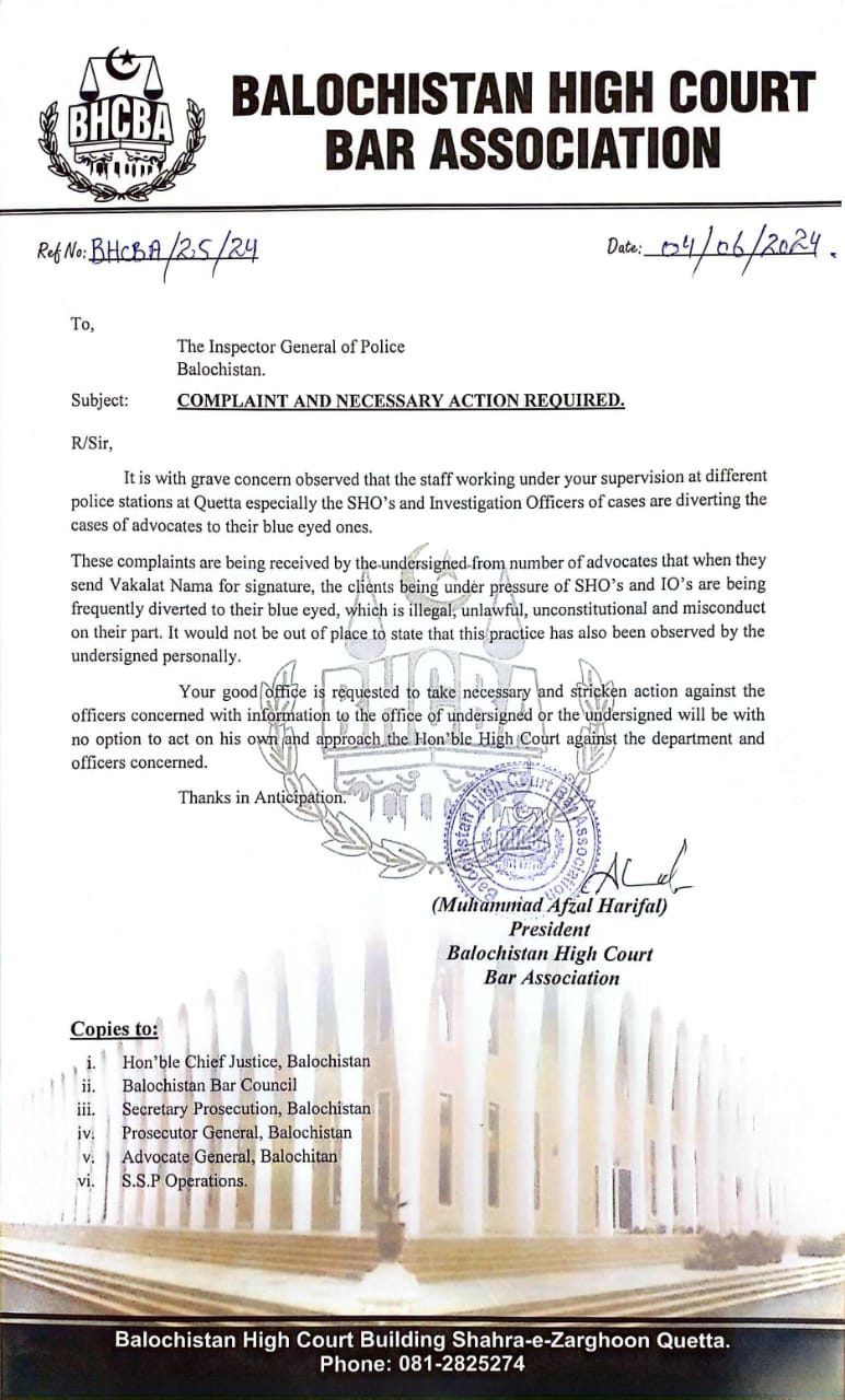 Quetta, June 4, 2024- In a bold move to uphold legal integrity, the President of the Balochistan High Court Bar Association, Muhammad Afzal Harifal, has taken a firm stance against alleged unethical practices within the police department. Harifal has sent a formal letter to the Inspector General (IG) of Balochistan, highlighting concerns over the conduct of Station House Officers (SHOs) and investigating officers at various police stations.