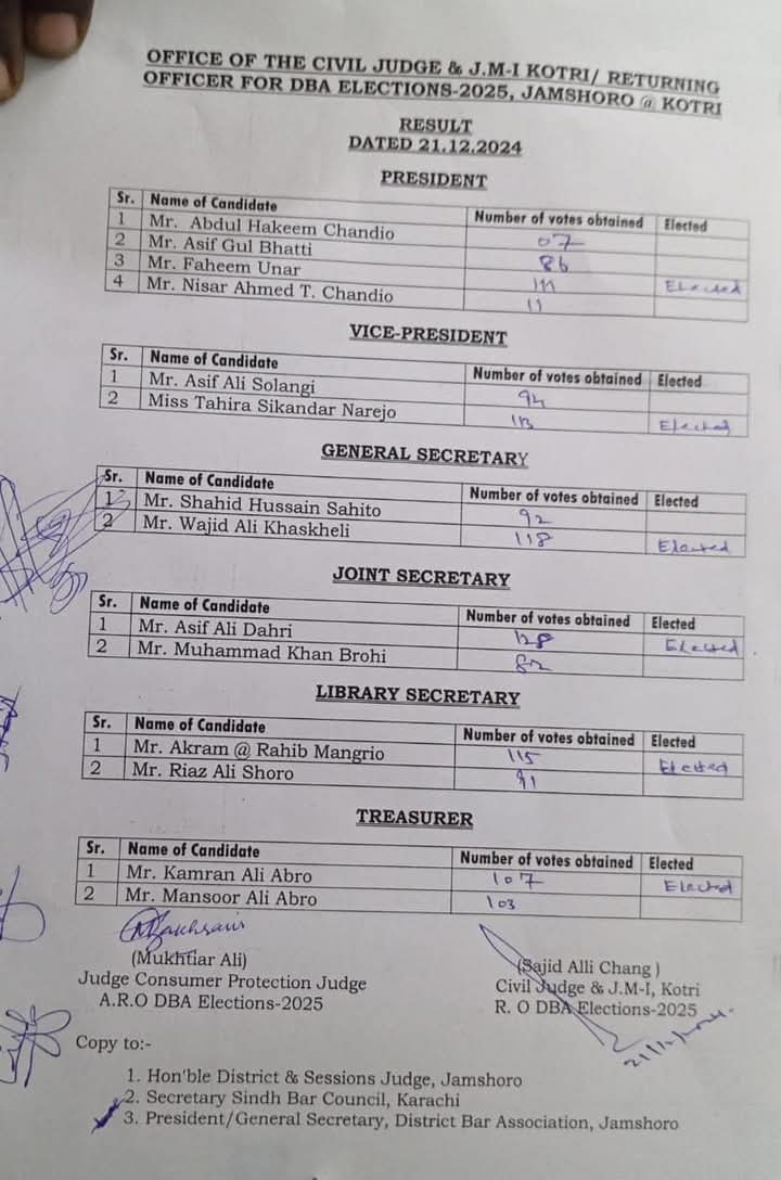 Jamshoro: The Jamshoro Bar Association has announced the results of its 2025 elections, marking a new leadership era with a diverse team of representatives.