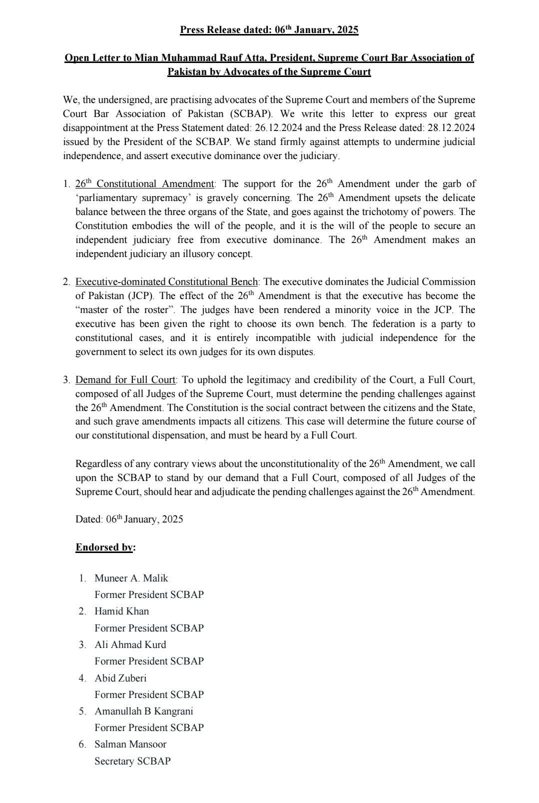 A practicing group of advocates of the Supreme Court of Pakistan, including several senior members of the legal fraternity, have issued an open letter to Mian Muhammad Rauf Atta, President of the Supreme Court Bar Association of Pakistan (SCBAP). The letter expresses profound disappointment with recent press releases dated 26th and 28th December 2024 issued by the SCBAP leadership, which the signatories believe undermine judicial independence and fail to represent the collective voice of the Bar.