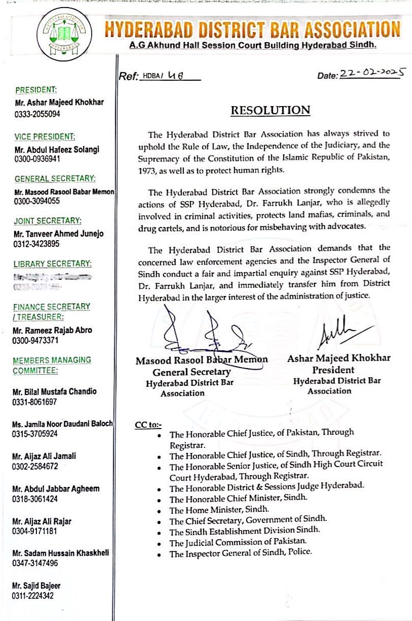 The Hyderabad District Bar Association, the All Pakistan District and High Court Bar Associations, and the Supreme Court Bar Association of Pakistan have all joined forces in demanding a fair and transparent inquiry into the matter and the immediate transfer of SSP Dr. Farrukh Lanjar.