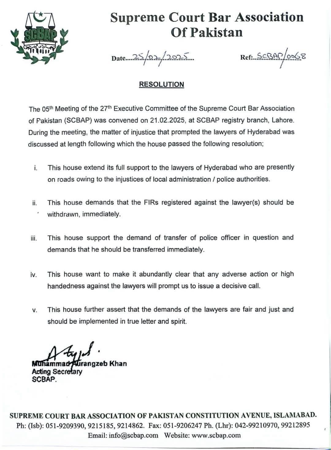 Led by Acting Secretary Muhammad Aurangzeb Khan, the SCBAP expressed solidarity with the lawyers and demanded that any First Information Reports (FIRs) filed against them be withdrawn immediately. The association also reiterated its call for the transfer of SSP Lanjar and warned that any further high-handedness against lawyers would prompt strong, decisive action from the legal community.