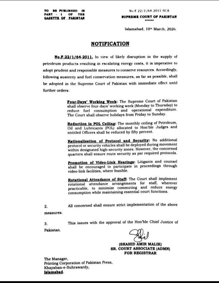 The Supreme Court of Pakistan has introduced a series of austerity and fuel conservation measures in response to the potential disruption in the supply of petroleum products and rising energy costs.