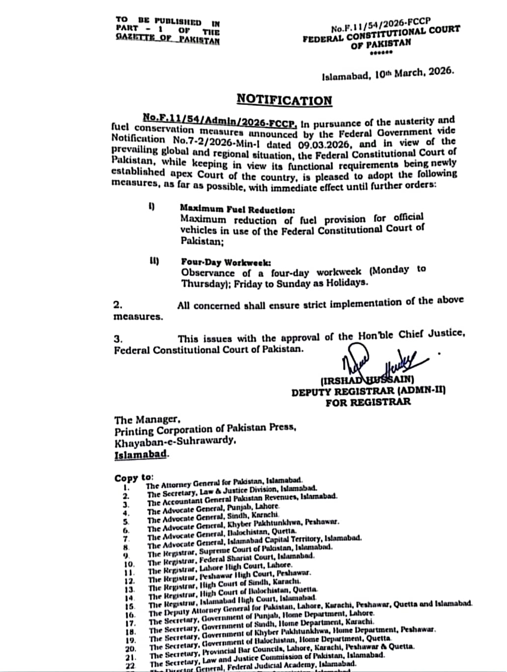 ISLAMABAD, March 11, 2026: In a move mirroring the Supreme Court’s recent directive, the Federal Constitutional Court of Pakistan has issued a notification implementing strict austerity and fuel conservation measures. The new policy, effective immediately, introduces a four-day workweek and significantly reduces fuel quotas for official vehicles.