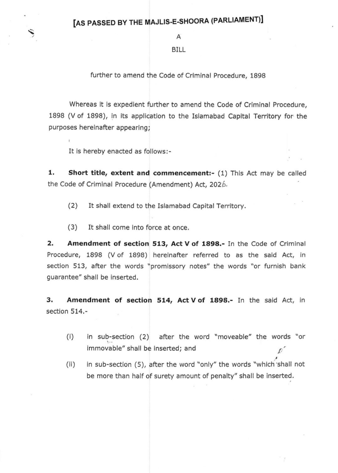 Islamabad, March 2026 — The Majlis-e-Shoora (Parliament) has passed the Code of Criminal Procedure (Amendment) Act, 2024, introducing significant reforms to the law governing sureties, bail bonds, and penalty recovery in the Islamabad Capital Territory.
