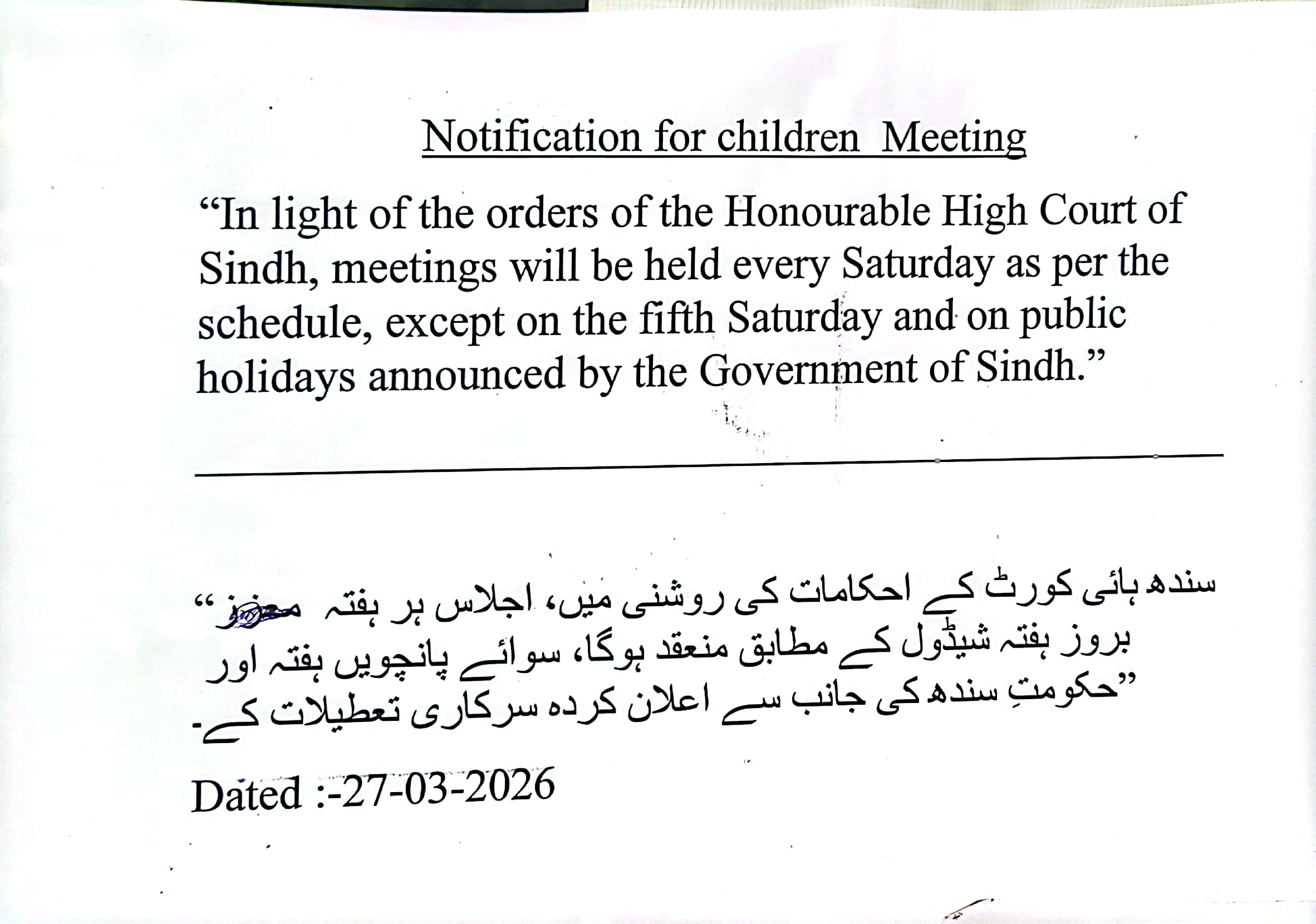 Karachi, March 27, 2026 — The High Court of Sindh has confirmed that although no regular court proceedings will be conducted on Saturdays, the child visitation meetings will continue as per the established schedule until the fourth Saturday of every month.