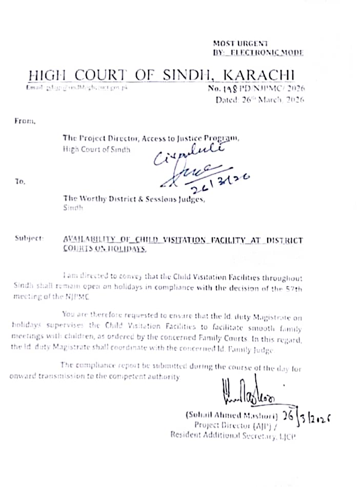 In a related development, another circular issued on March 26, 2026, by the Project Director, Access to Justice Program, directed all District and Sessions Judges across Sindh to ensure that child Visitation Facilities remain open on holidays as well. The directive emphasizes that the duty magistrate must supervise the meetings to facilitate smooth interaction between children and parents, in compliance with the decision of the 57th meeting of the NJPMC.