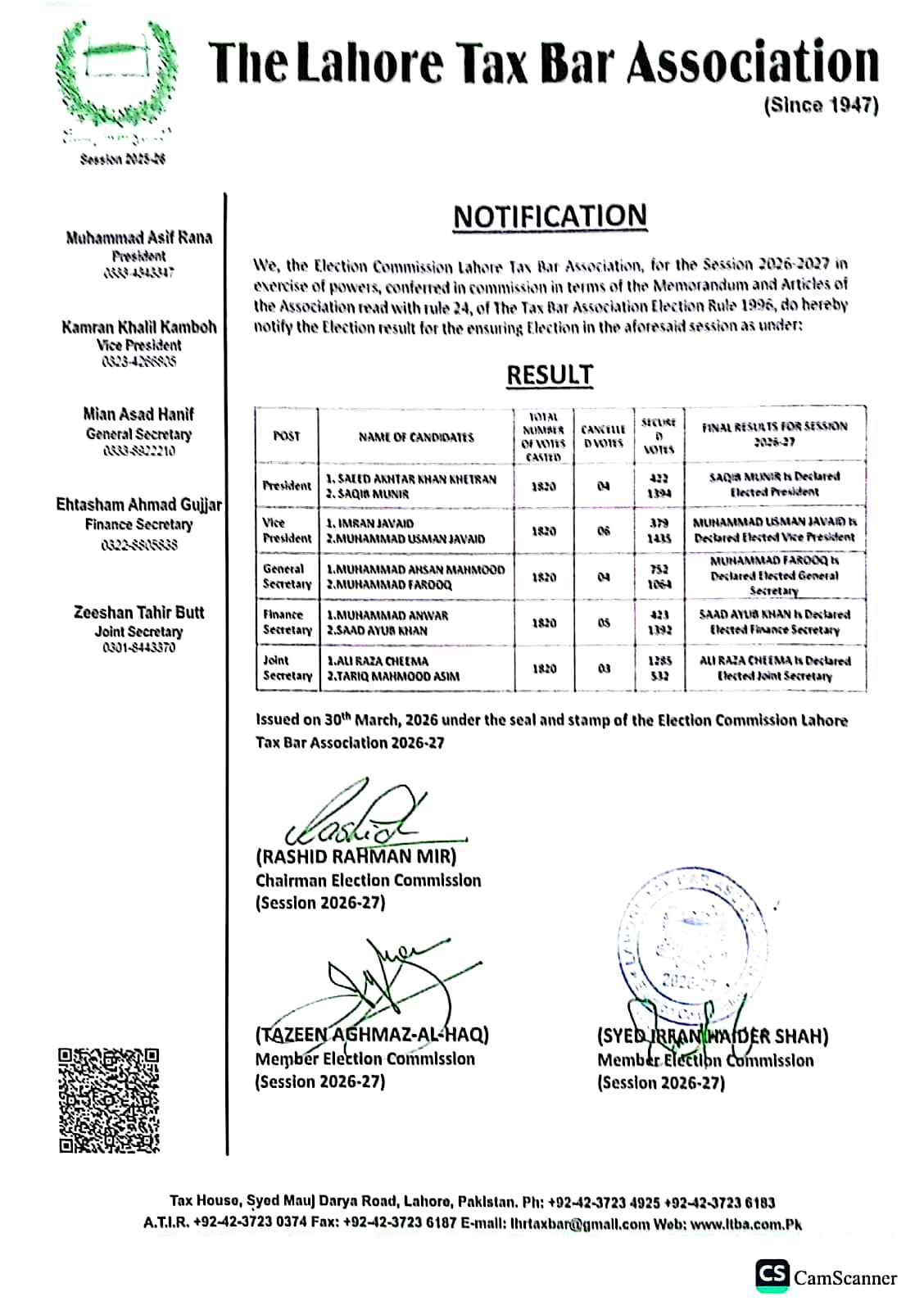 Lahore, March 30, 2026 — The Election Commission of the Lahore Tax Bar Association (LTBA) has officially announced the results for the Session 2026–2027, confirming the newly elected cabinet following a transparent voting process.