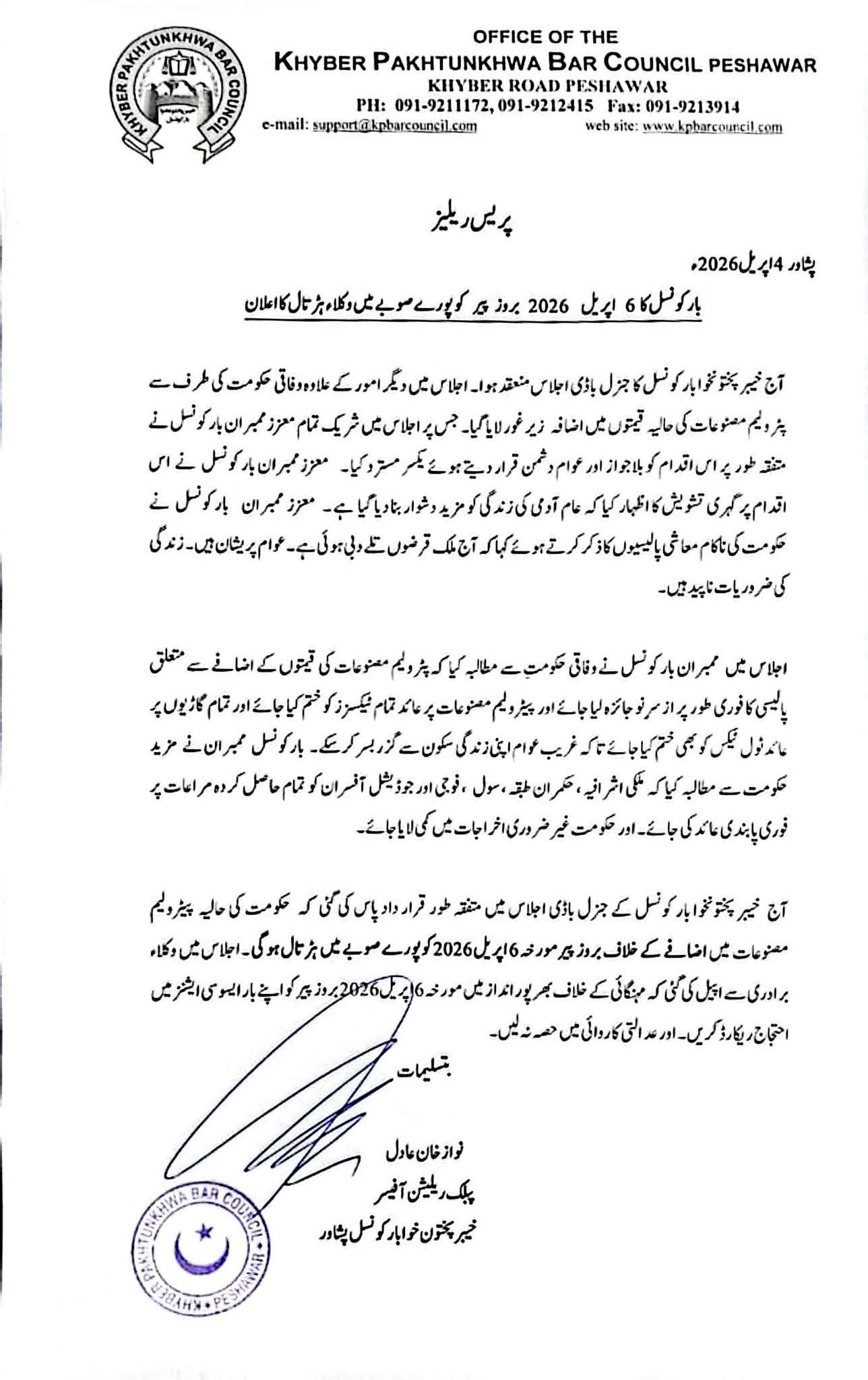 The Khyber Pakhtunkhwa Bar Council has announced a complete lawyers’ strike across the province on Monday, April 6, 2026, in protest against the recent increase in petroleum prices by the federal government. The decision was taken during a General Body meeting held in Peshawar, where members unanimously rejected the hike, terming it unjustified and harmful to the public.