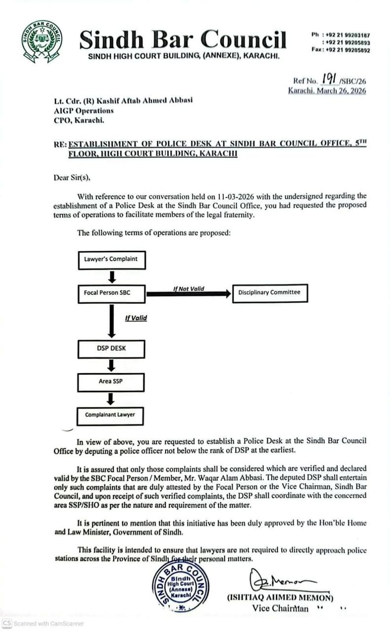 The Sindh Bar Council (SBC) has proposed the establishment of a dedicated Police Desk at its office in the Sindh High Court building, Karachi, aimed at providing a streamlined and institutional mechanism for addressing complaints of lawyers. The initiative is intended to reduce the need for members of the legal fraternity to directly approach police stations and to ensure a more organized system of coordination with law enforcement authorities.