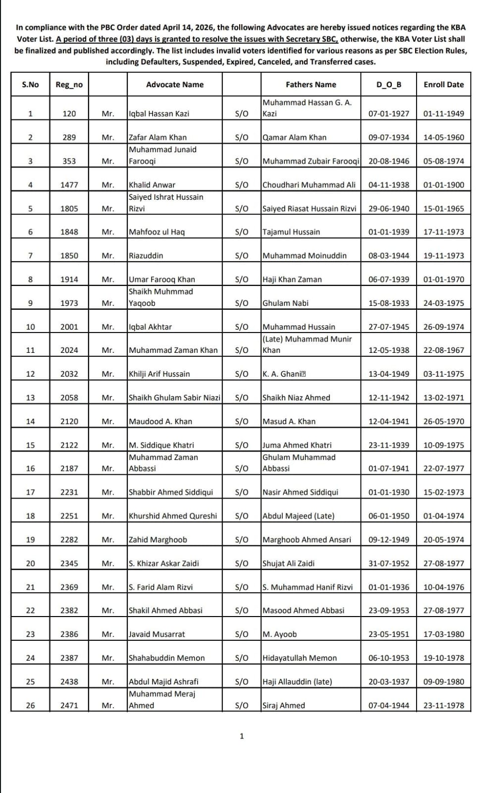 In a related update, the Sindh Bar Council has also released a list of advocates who currently do not meet the eligibility requirements for inclusion in the KBA Voter List, as directed under the Pakistan Bar Council’s order dated April 14, 2026. A three-day window has been provided for rectifying discrepancies before the voter list is finalized.