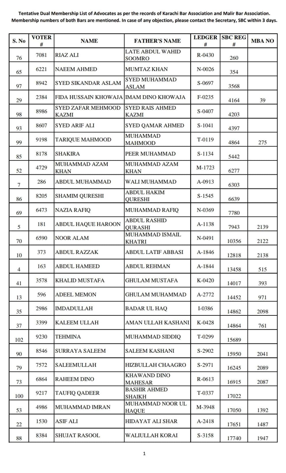 The Sindh Bar Council has issued the tentative Dual Membership List for the forthcoming Karachi Bar Association Election 2025–2026. The list outlines advocates whose memberships appear in both the Karachi Bar Association and the Malir Bar Association, with corresponding membership numbers from each bar. Advocates have been given three days to raise any objections with the Secretary, SBC.