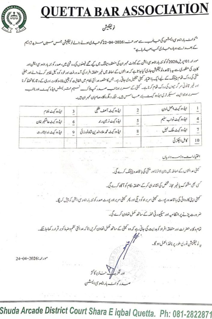 The Quetta Bar Association has issued a notification calling upon its President to consider the formation of a dedicated Anti-Narcotics Committee in light of growing concerns over drug use within the legal community. The move reflects increasing awareness about the harmful impact of narcotics on professional conduct and the overall environment of the Bar.